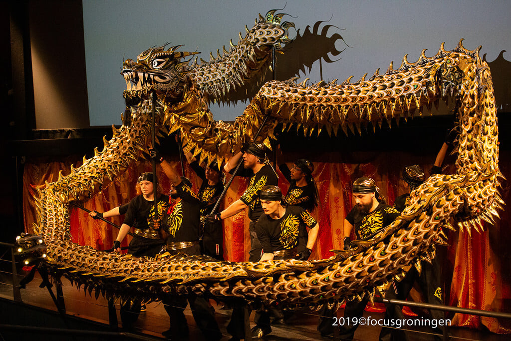 Een spectaculaire dans, begeleid door live muziek op trommel, gong en bekkens.
